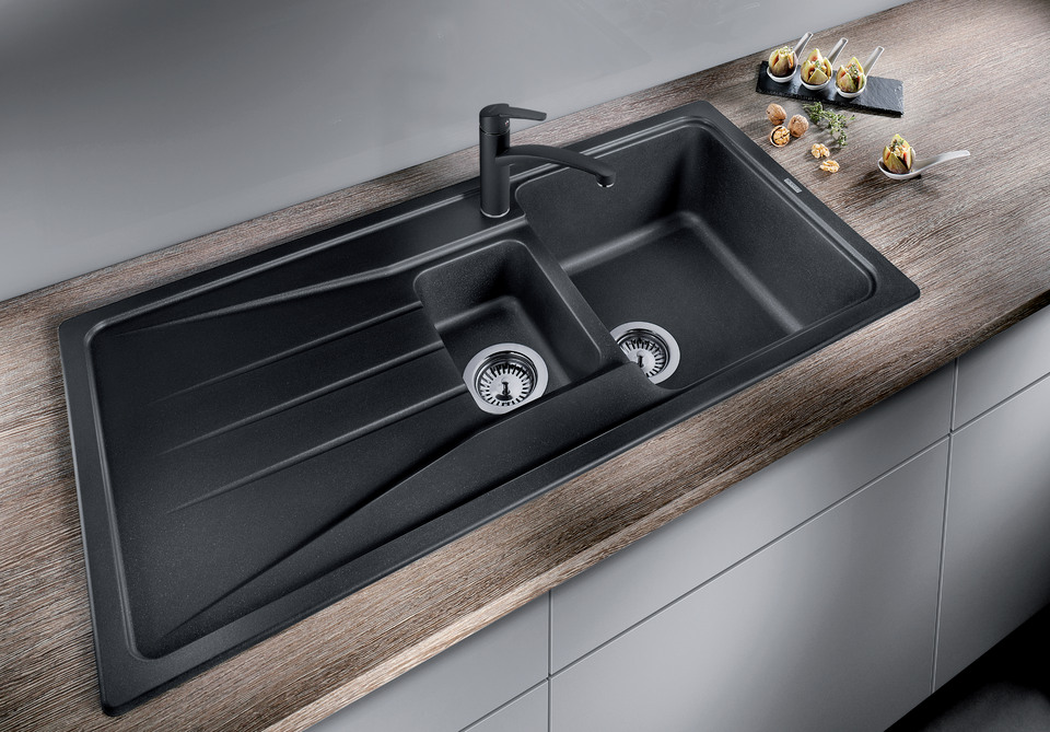 Milky patches can soon show up on your stylish dark sink. These are caused by limescale deposits, which can vary hugely from place to place, and depending on the state of your water pipes. Such stains also pick up deposits from substances like tea or coffee, and are thus responsible for discolouration. But all this isn’t as bad as it sounds. Luckily, BLANCO ANTIKALK, a little vinegar-based cleaner or diluted citric acid and hot water can come to your rescue. The limescale will dissolve if you clean your kitchen sink thoroughly with these substances. If you don’t want to constantly have to contend with unsightly marks, be sure to dry your sink off with a microfibre cloth after every use. Doing this will prevent the limescale from occurring in the first place.