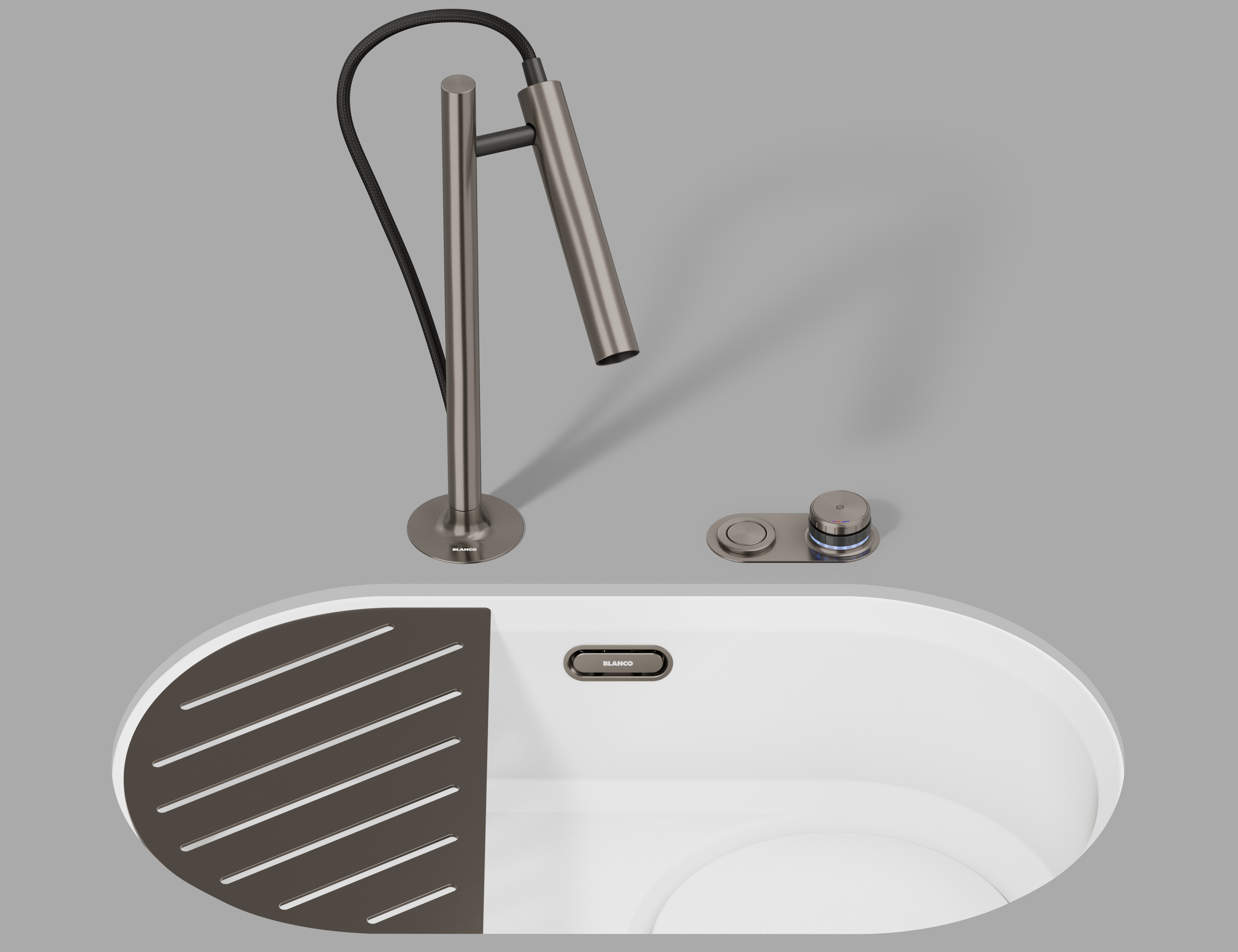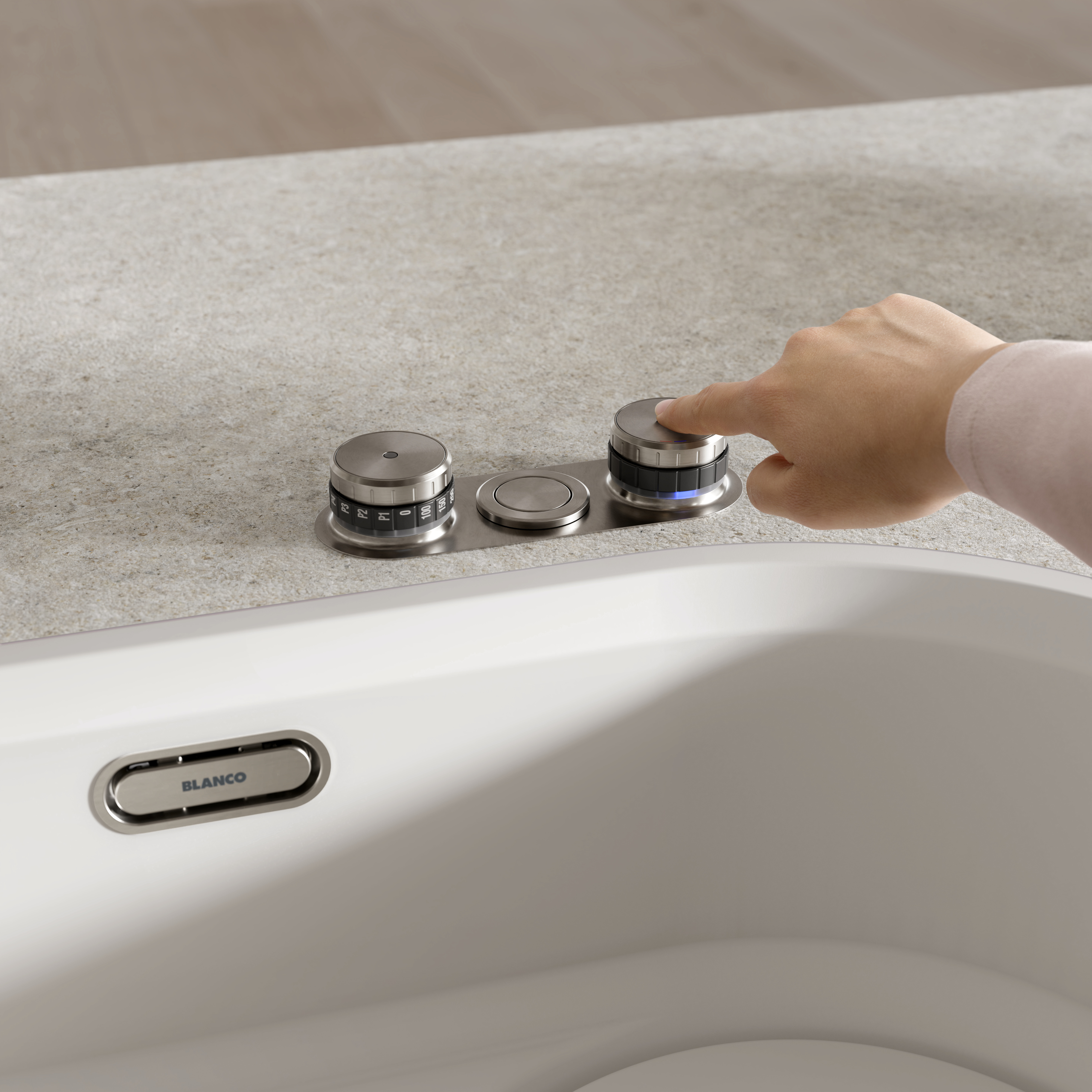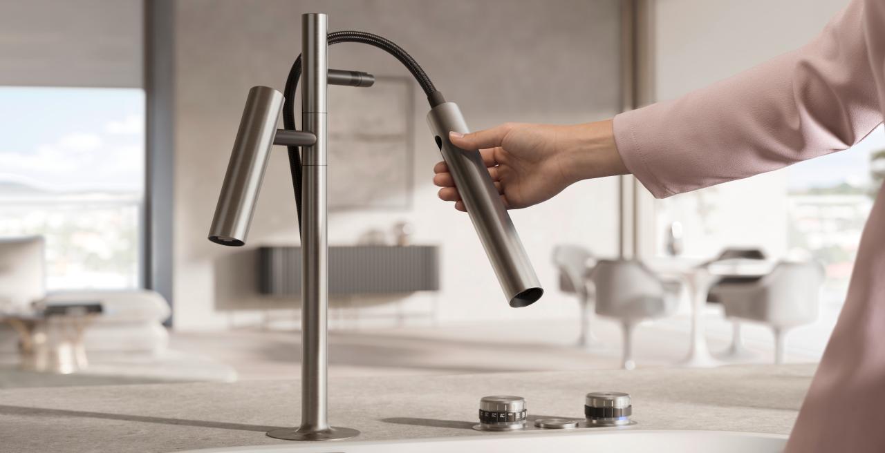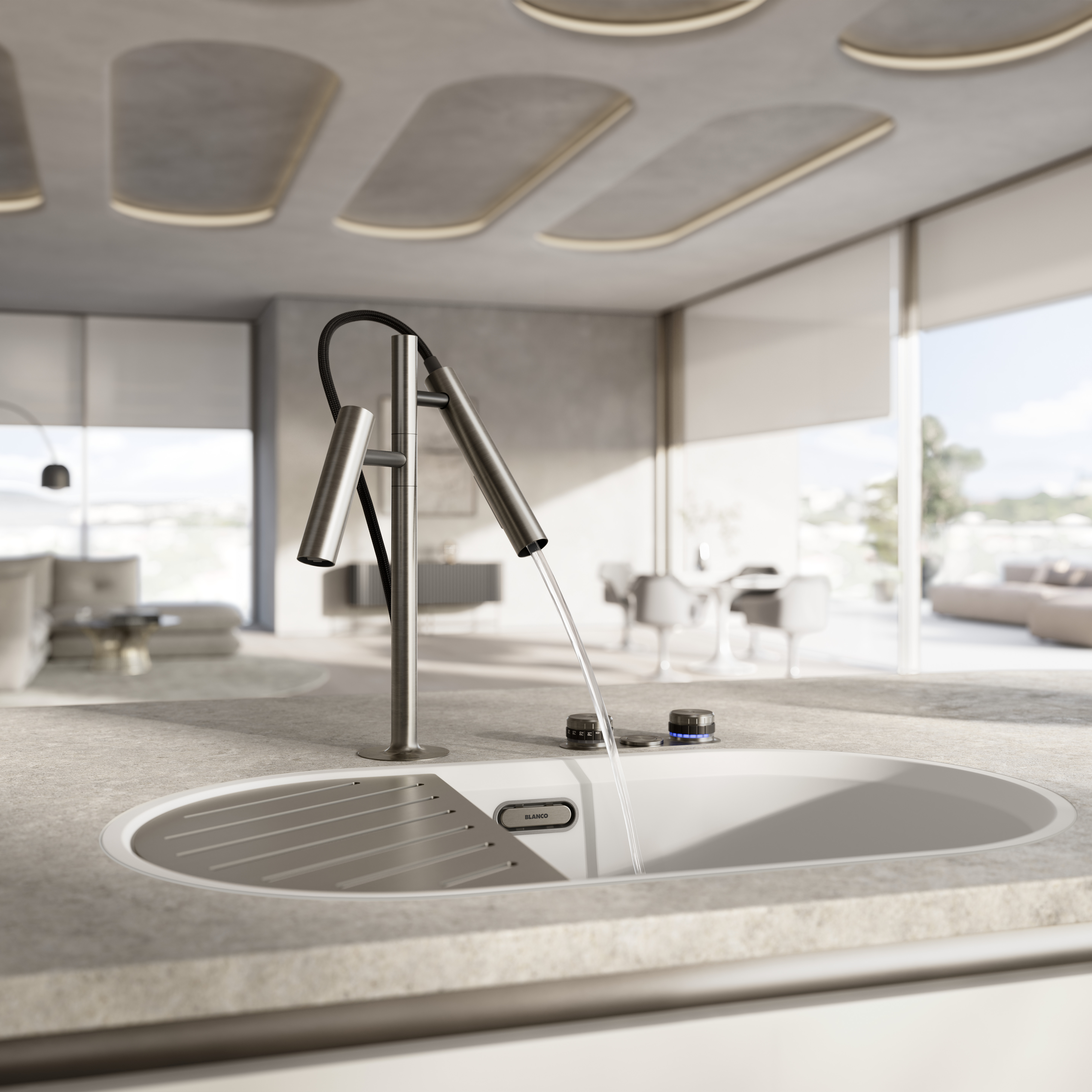 Two spray modes — a powerful shower spray and a smooth, steady stream — make it easy to handle everything from rinsing fruit to cleaning pans. Instead of a traditional lever, LUNEOO introduces a separate, minimalist control unit that can be positioned wherever it suits your workflow: left, right or behind the sink. Operation is intuitive — touch to start or stop the water flow, one turn for volume, another for temperature.